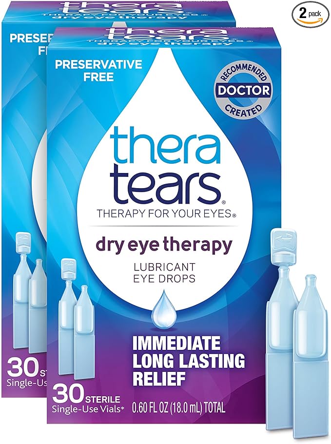 - Dry eye relief without preservatives for sensitive eyes: TheraTears preservative-free lubricating eye drops in single-use vials provide immediate, long-lasting relief from dry eye symptoms