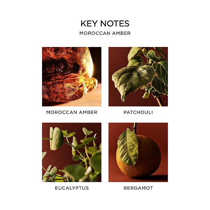 - EARTHY & WOODY - An alluring blend of Moroccan amber, sweet patchouli, heliotrope, and bergamot accented with a hint of eucalyptus that creates an exotic atmosphere.