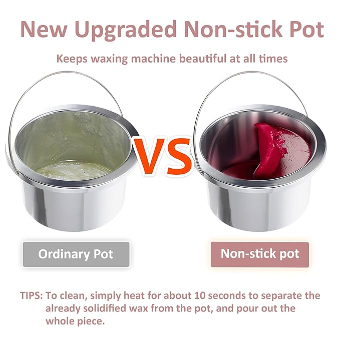 - 【New Upgraded Non-stick Pot】Adopt a new upgraded non-stick pot. Just heat it for 5-10 seconds to let the cooled wax in the pot detach from the inner wall of the pot, and then use a rag or wax stick to clean up the residual wax in the pot. It reduces the trouble of cleaning after the hair removal work is completed, and also keeps the body beautiful and tidy. Keep your wax heater looking new forever.