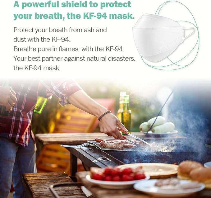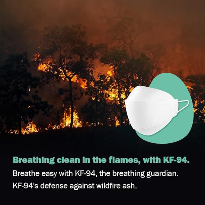 - Peak Protection Against Wildfire Smoke and Ash: Our KF94 masks offer exceptional filtration of PM2.5, smoke, and especially oil-based particles present in ash, through their sophisticated quad-layer filtration. Crafted for comfort and a secure fit, they ensure comprehensive coverage and breathability in wildfire-affected areas, safeguarding you from a wide array of airborne pollutants.