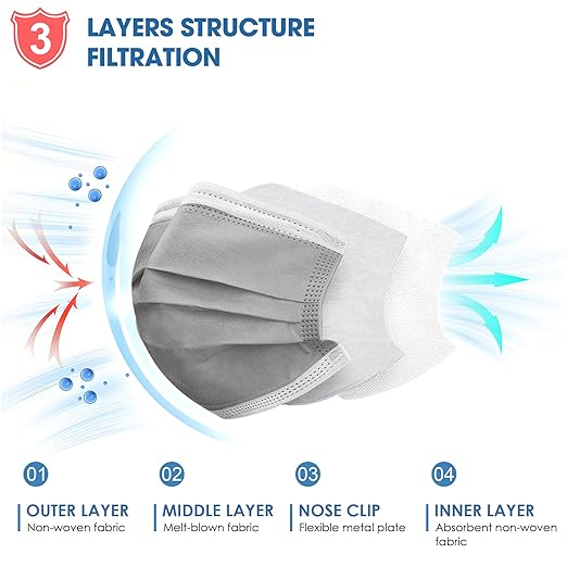 100PCS Grey 3 ply Disposable Face Masks,Protection Face Masks For Home,School,Office and Outdoors