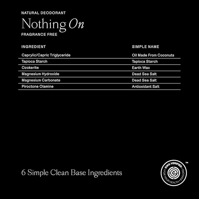- Nothing On - This release pares it down to our core formula, leaving nothing between us but skin. Plush tapioca starch and conditioning coconut oil also give this sensitive skin deodorant a smooth glide.