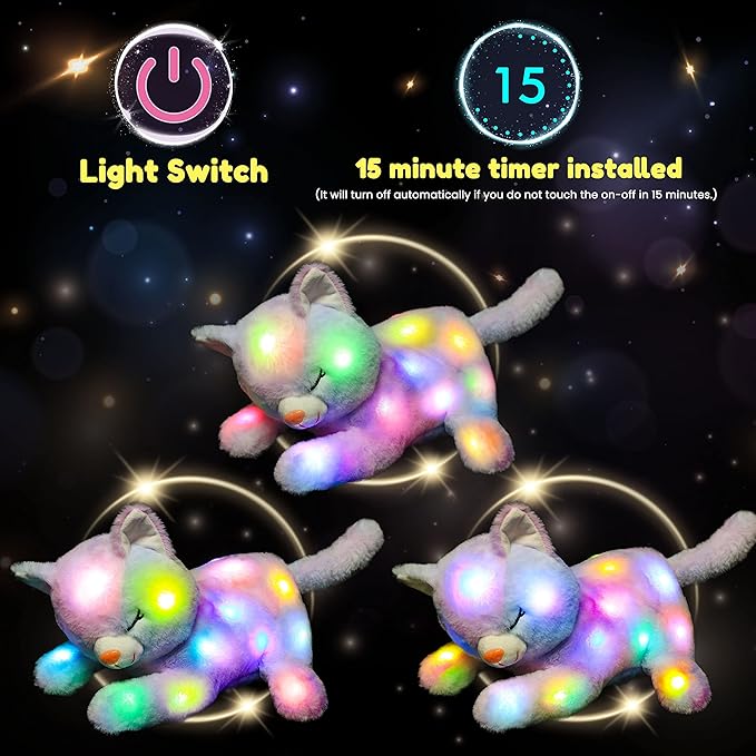 - COLORFUL CHANGING LIGHTS & AUTOMATIC TURN OFF: This plush cat features of glowing in the dark and the light will change multiple colors every few seconds. Additionally, we installed a 15 minute timer inside which will turn off automatically if you do not touch the on-off in 15 minutes. While, you can still turn it off as you like by pressing the switch again.