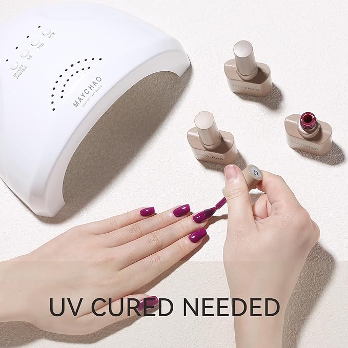 - Fast and Simple Nail Polish: MAYCHAO Gel polish must be cured under an LED light. It is necessary to apply a base and top coat. Average LED light duration is 60-120 seconds. Simple application and tenacity.