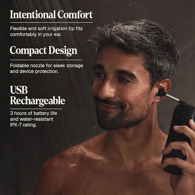 - Easy to Use and Store: Wush is water resistant and safe to use in the shower. Its flexible, compact nozzle connects to a soft irrigation tip that fits comfortably in your ear, and folds down for easy storage.