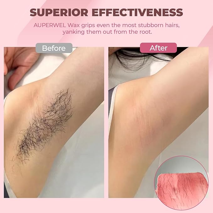 - Effective Hair Removal Result: Whether you believe it or not, our wax beans for hair removal are born to remove both coarse and fine hair. Auperwel wax beads for brazilian waxing have no issues getting 90% of hair whether it's the thin stuff on your upper leg or the more stubborn hairs on the bikini area. It hugs EVERY hair securely to pull them from the root and enjoy 3-6 weeks of flawless!