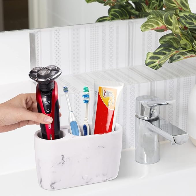 - SAVE SPACE: With 6.7” W x 2.6” D x 3.9” H dimensions, this toothbrush holder features two convenient storage slots. Perfect for storing slender items like toothbrushes and electric toothbrushes, along with a larger compartment for toothpaste and razors, helping you maximize countertop space