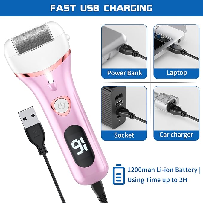 - 【Rechargeable & Equipped with Lcd Digital Battery Display and Light】The electric foot file with high quality 1200mAh large capacity lithium battery can working for about 60-90 Minutes. Only charge about 2-3 Hours. And it equipped with lcd digital battery display and light, you can see how much battery left and when to charge. Foot care for women, this foot scrubber dead skin remover's light turns on automatically while the foot file is working, shining light on your dead skin.