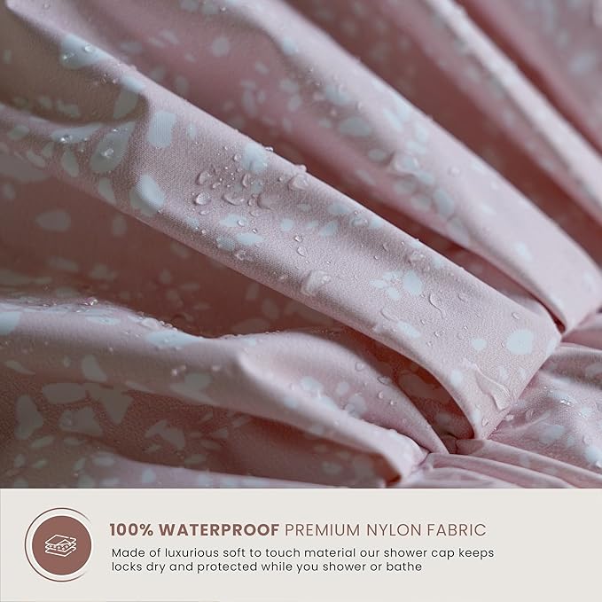- THE AVERAGE SHOWER HAIR CAP is poorly made with flimsy materials, FALLING APART after a few uses. Crafted out of DURABLE, 100% waterproof polyester with a LIGHTWEIGHT, BREATHABLE feel, our washable shower cap is SOFT TO THE TOUCH and resistant to wrinkling & tearing. So you can count on it for LONG-LASTING PROTECTION against moisture – and say buh-bye to the WASTEFUL CYCLE of plastic hair caps.