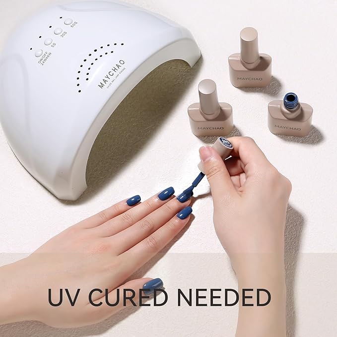 - Fast and Simple Nail Polish: MAYCHAO Gel polish must be cured under an LED light. It is necessary to apply a base and top coat. Average LED light duration is 60-120 seconds. Simple application and tenacity.