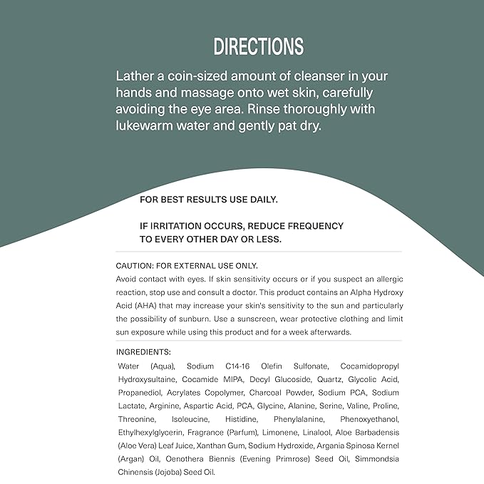 - Men's Facial Cleanser: Formulated with 2.5% glycolic & salicylic acid and Activated Charcoal. Our gentle yet effective glycolic peel reduces breakouts and dark spots.