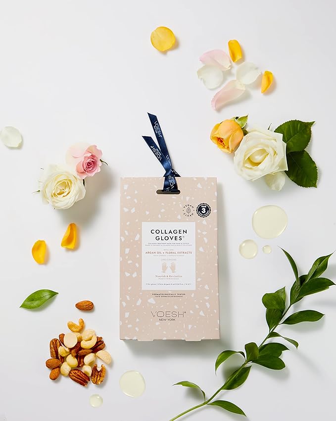- Infused with Vegan, Skin-Loving Ingredients. Collagen Gloves are enriched with a blend of vegan collagen, argan oil and shea butter, making them the perfect remedy for dry, cracked hands. They are chock full of antioxidants and anti-inflammatory properties for healthy, happy hands.
