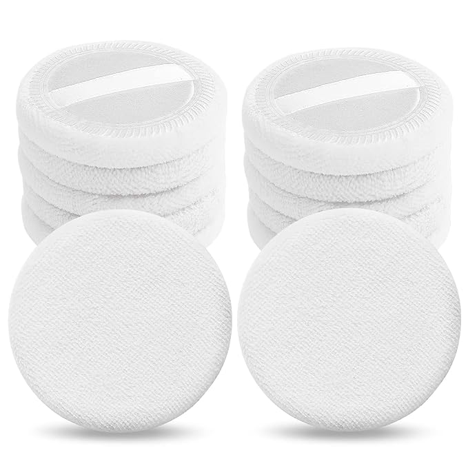 Sibba Loose Powder Puff 12 Pieces Round Velour Face Makeup Compact Body Container Setting Pressed Blending Foundation Cream Make Up Ribbon Strap Sponge Cushion Applicator (White)