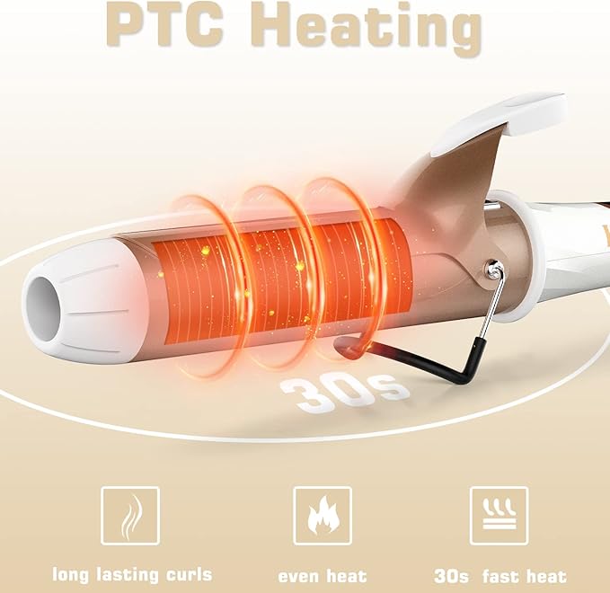 - PTC 30s INSTANT HEATING SAVE TIME: Hair wand curling iron heats up instantly in 30s and reduces your waiting time. Distribute the heat evenly to each hair. Perfect constant-temperature function prevents damage to the hair. Keep a long-lasting and charming styling all day long. The safety stand prevents the hair curling iron from touching the table and being scalded.