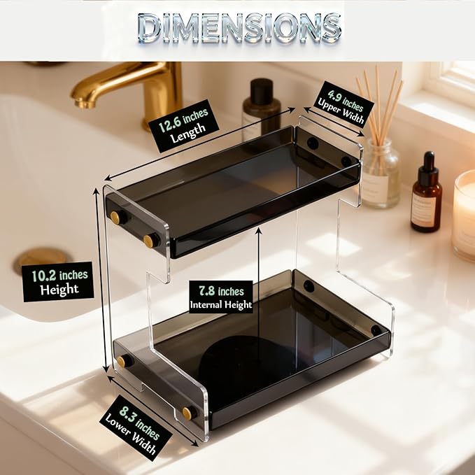 - WIDE APPLICATIONS: Simple is for assembling, but the application is really not simple. The 2 tier bathroom organizer can be used as a multi-function home organization: perfume organizer, makeup organizer, bathroom trays, vanity tray organizer. It can be also used as an organizer for cosmetics, toiletries, towels, nail polish, skincare. Can be used as a spice rack and under sink organizer in your kitchen. Or it can also be used in office to organize the stapler, plants, tools on your desk.