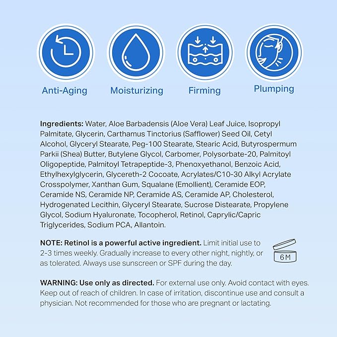 - Special Feature : Anti-aging formula with Retinol for reducing wrinkles and fine lines. Deep hydration with Bio-Active Ceramides and Hyaluronic Acid. Skin-firming and lifting effects for face, neck, and décolleté. Nourishing ingredients like Vitamin E and Aloe Vera for healthy skin. Nighttime absorption for maximum smoothing and lifting results. Anti-aging formula with Retinol for reducing wrinkles and fine lines. Deep hydration with Bio-Active Ceramides and Hyaluronic Acid. Skin-firming and lifting effects for face, neck, and décolleté. Nourishing ingredients like Vita… See more