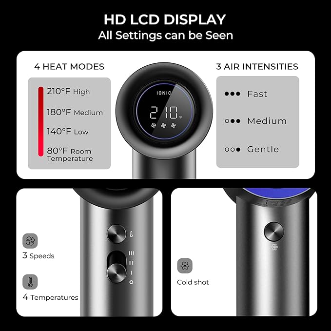 - 3 Speed, 4 Heats & Cool Shoot with LCD Display - There are 4 heat settings(Room Temperature/140℉/180℉/210℉) and 3 speed(Gentle/Medium/Fast) for you to dry your hair effectively and one-button cool shoot to set your styling. Besides, with HD LCD display, all settings can be seen which is more convenient to find the best setting to your hair types.