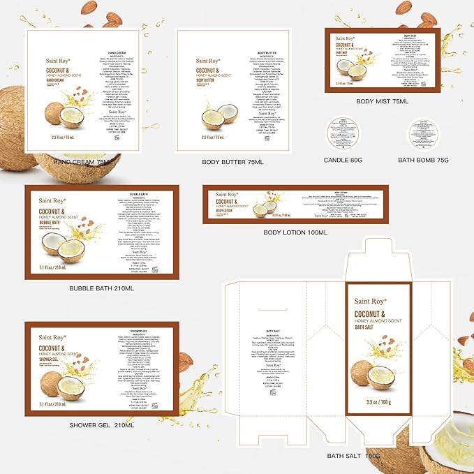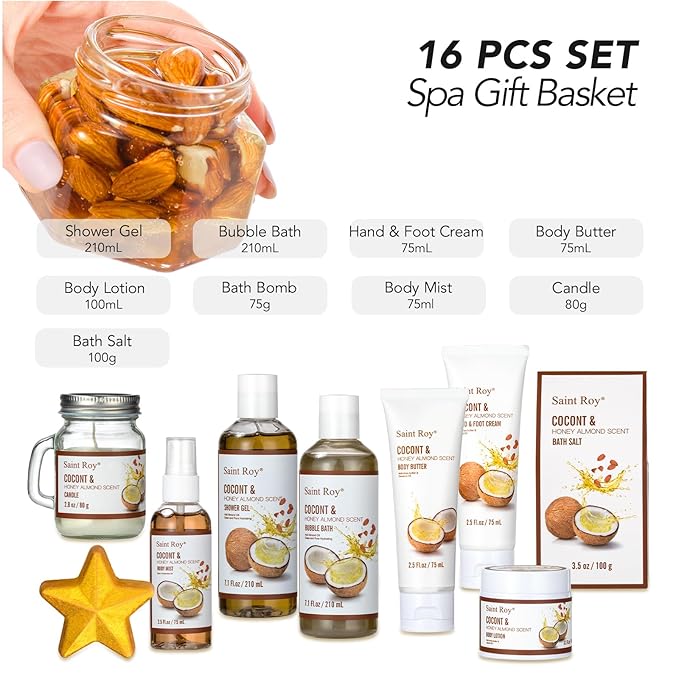 - 【Bath Relaxing Body and Bath Gift Set】Spa Gift Baskets for Women & Men with Natural Nourishing Ingredients. We use safe, natural ingredients like Almond Oil and Jojoba Seed Oil. We add moisturizing Shea Butter and nourishing to help make your skin feel smooth and silky. BATH GIFT BASKET SET FOR WOMEN: These rejuvenating bath products contains Coconut essential Oil work well with all skin types. Honey Almond & Coconut Home Spa Set Fragrant Lotions with Extra Large Basket is Luxurious Bath christmas spa gift sets for women and men.