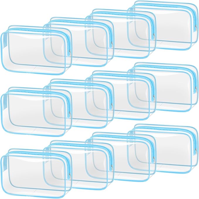 - 【Water-Resistant】This 12-pack of reusable clear makeup bags is crafted from sturdy PVC, this toiletry bag helps protect your essentials from minor spills and splashes. The smooth surface is easy to wipe clean, ensuring hassle-free maintenance.