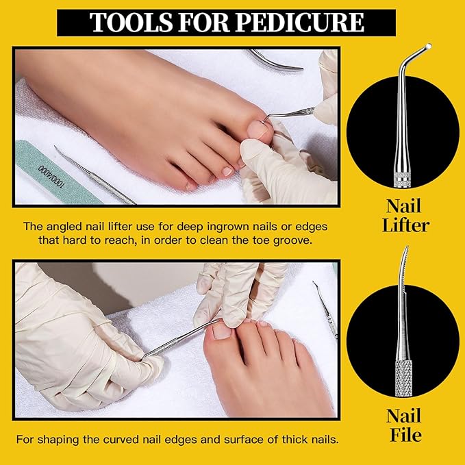 - Nail Lifter & Double Sided Nail File In Ingrown Toenail Tool: The nail lifter is equipped with the angled heads. It can lift the nail corners to reach nail edge easily and remove the stubborn debris effortlessly. It helps to get rid of the pain and discomfort caused by ingrown toenails. The stainless steel nail file consists of a straight end for filing the outer flat surface of the nails and a curved end for trimming the curved surface, nail edge and nail corners.