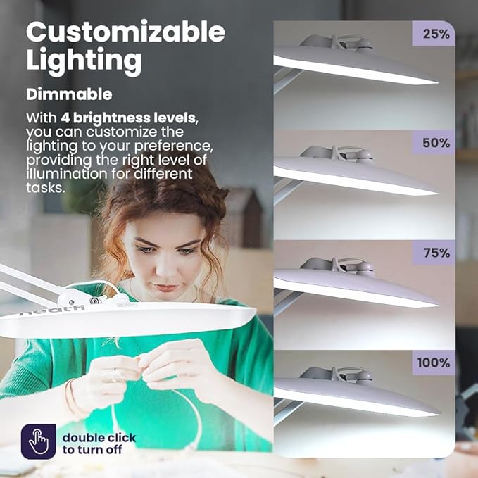 - Personalized Lighting – Features 4 brightness levels (100%, 75%, 50%, 25%) and 3 light modes (3000K–6000K), powered by 20W with 182 SMD LEDs, for tailored lighting needs from projects to reading.