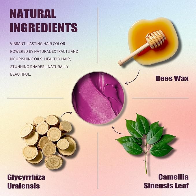 - Hair Dye Material: water, beeswax, ash wood wax, cetearyl alcohol, licorice extract, tea extract (camellia), stearic acid, pvp/va propylene acrylate copolymer, peg-60 castor oil, titanium dioxide. Our ingredients are gentle and non-irritating, and will not cause adverse effects on the hair.