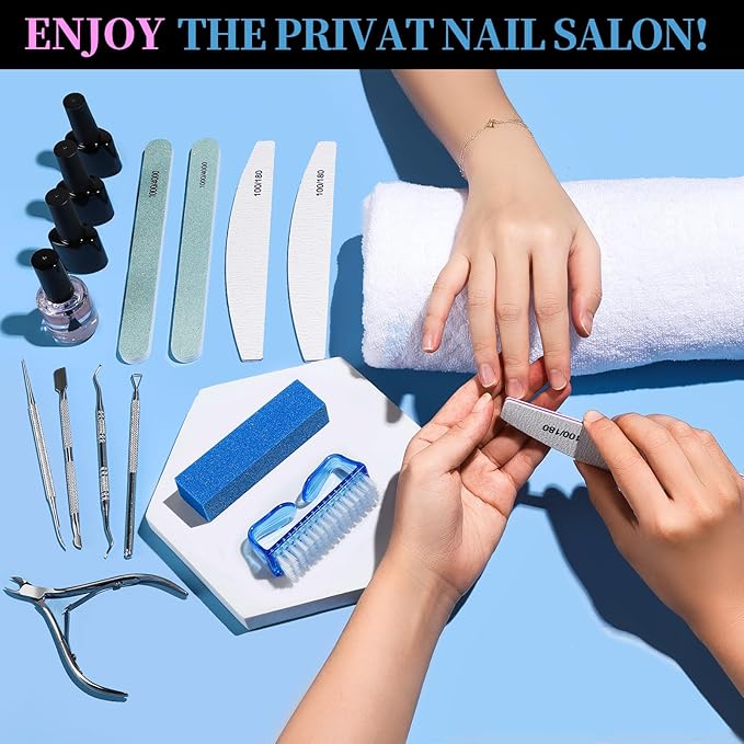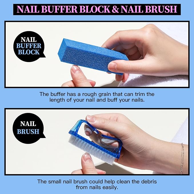 - Practical Nail Care Kit For Filing & Polishing: The nail files 100/180 grit are coarse-grained, suitable for removing nail gel or nail polish, also for toenails. For accurate filing on the edges of the nail and trimming the shapes and length according to your needs. The buffer and polishing files are suitable for polishing uneven nail surface to make your nails smooth and shiny. The small nail brush can help to easily brush the residue off the nails.