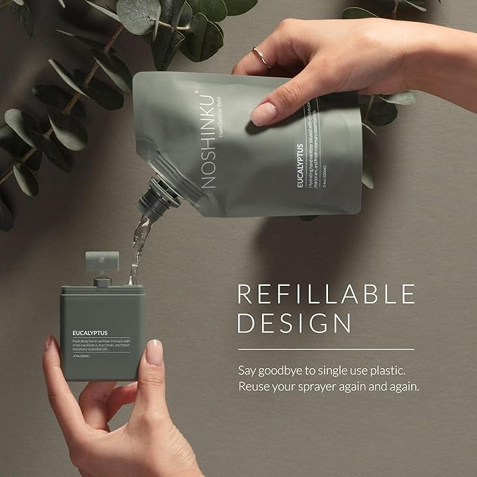 - REFILLABLE POCKET SPRAYERS: Includes 6 refillable pocket hand sanitizer sprayers in Bergamot, Eucalyptus, Lavender, Orange Coriander, Vetiver and Limon Each premium soft-touch travel hand sanitizer delivers 300+ sprays and helps reduce plastic waste with our eco-conscious refill system.