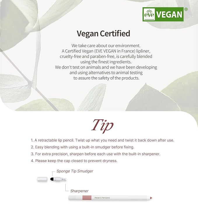 - [Vegan Certified] We take care about our environment. A Certified Vegan (EVE VEGAN in France) lipliner, cruelty-free and paraben-free, is carefully blended using the finest ingredients. We don't test on animals and we have been developing and using alternatives to animal testing to assure the safety of the products.