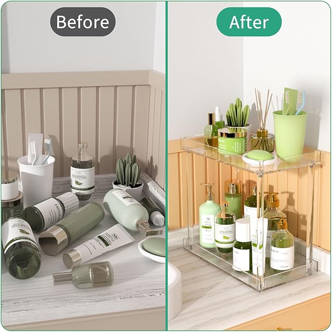 - STACKABLE CORNER STORAGE - Place on vanity countertops, in cabinets, and under the sink; One unit provides two levels of storage. The shelf is stackable to create vertical space-saving storage, corner design is ideal for smaller spaces. the corner vanity organizer adopts a Fan-shaped-dimensional design, which is more sturdy and stable; the Stackable bathroom organizer vanity storage can efficiently use space and bring a tidy countertop.