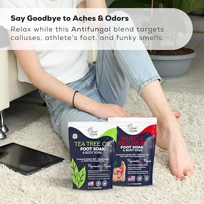 FOOT CURE Tea Tree Oil & Muscle Foot Soak with Epsom Salts - All-Natural Salts for Post-Workout Recovery - Softens Calluses, Soothes Sore & Tired Feet, Foot Odor Control, Spa Pedicure (Pack of 2)
