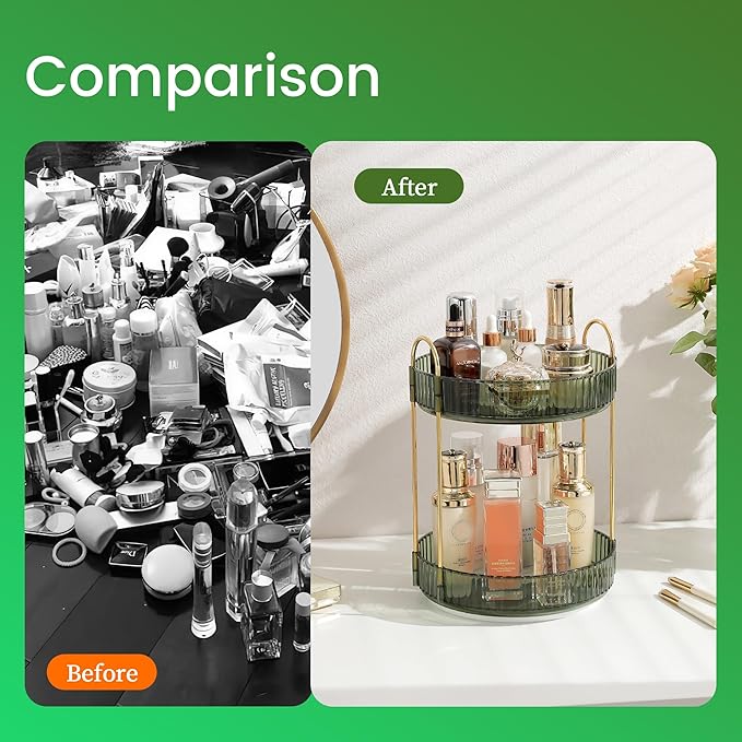 - 👑【Versatile Uses】This dresser perfume organizer serves multiple purposes, making it an excellent choice as a cosmetics organizer, perfume holder, lipstick organizer, bathroom countertop organizer, dresser organizer, skincare storage solution. Besides as a makeup holder, you can also use it as a practical lazy susan organizer in the kitchen. Its seamless compatibility with different settings adds a touch of finesse to your house's overall ambiance.