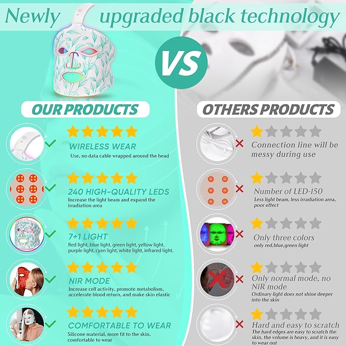 - [Wireless Red Led Face Mask Light Therapy]: Red light therapy for face is designed to be wireless, compared with the traditional wired LED mask phototherapy face, it gets rid of the limitation of wire length, allowing you to move freely when using the skin phototherapy mask without affecting your care skin. Allows you to take care of your skin anytime, whether you're at home, at work, camping or traveling.