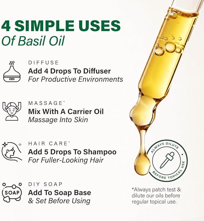- Perfect for aromatherapy & massages. This basil fragrance oil may be enjoyed in various methods apart from diffusion and skincare, such as through body massages. Add a few drops of basil fragrance oil with carrier oil to craft a massage oil.