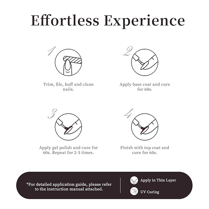 - Fast and Simple Nail Polish: MAYCHAO Gel polish must be cured under an LED light. It is necessary to apply a base and top coat. Average LED light duration is 60-120 seconds. Simple application and tenacity.