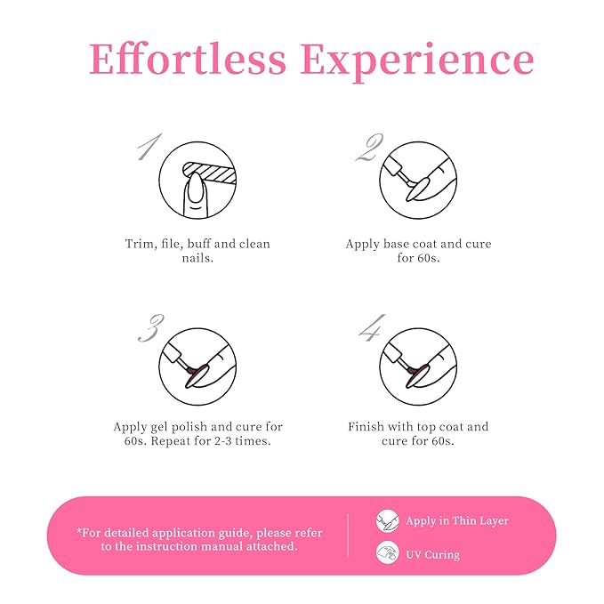 - Fast and Simple Nail Polish: MAYCHAO Gel polish must be cured under an LED light. It is necessary to apply a base and top coat. Average LED light duration is 60-120 seconds. Simple application and tenacity.
