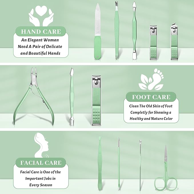 - Professional Nail Care Kit: Made of high-quality stainless steel, nail clippers are sharp and durable. Large, small, diagonal clippers can cut every corner of nails and trim thick/hard nails easily. The nail grooming kit is coated with an anti-rust green coating, which is pretty and practical, and also not easy to rust.