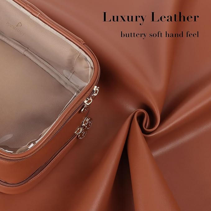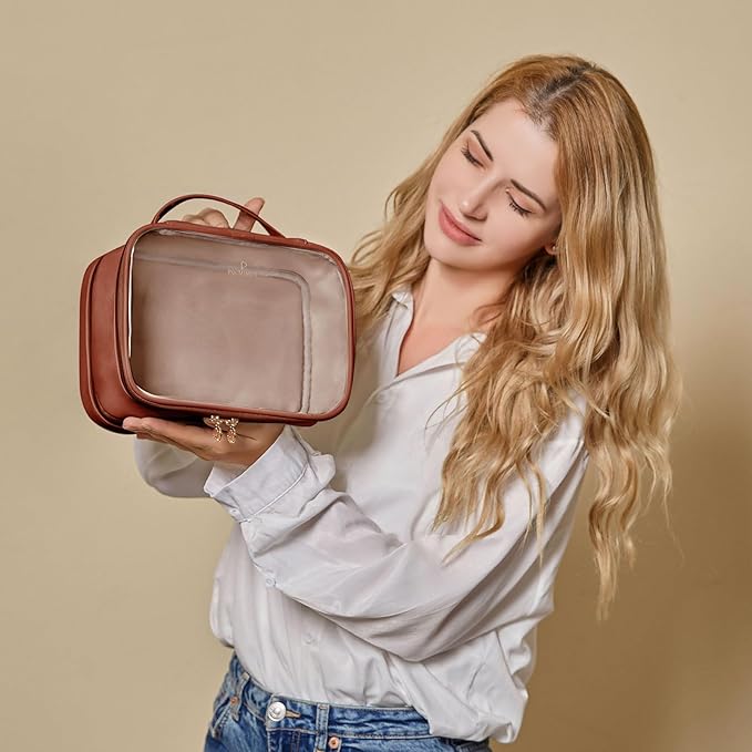 - PREMIUM QUALITY:This elegant clear makeup bag is crafted from high-quality PU leather with durability.The natural texture not only feels luxurious but also adds a touch of sophistication to your travel ensemble.