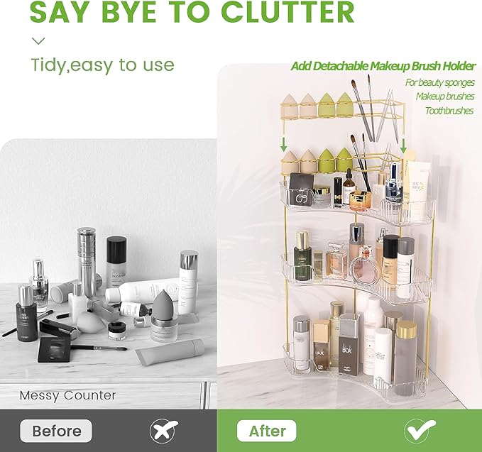 - 【Corner Makeup Organizer】Say goodbye to your cluttered countertop, our countertop organizer fully utilizes corner space, adding 100% extra storage space and keeping a tidy and organized bathroom counter