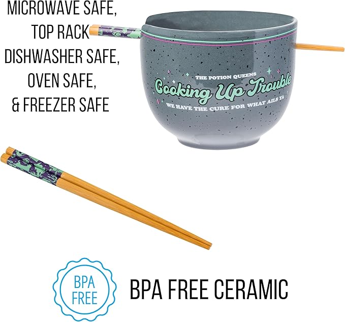 Silver Buffalo Disney Villains Featuring Ursula, Evil Queen, and Yzma Cooking Up Trouble Ceramic Ramen Noodle Rice Bowl with Chopsticks, Microwave Safe, 20 Ounces