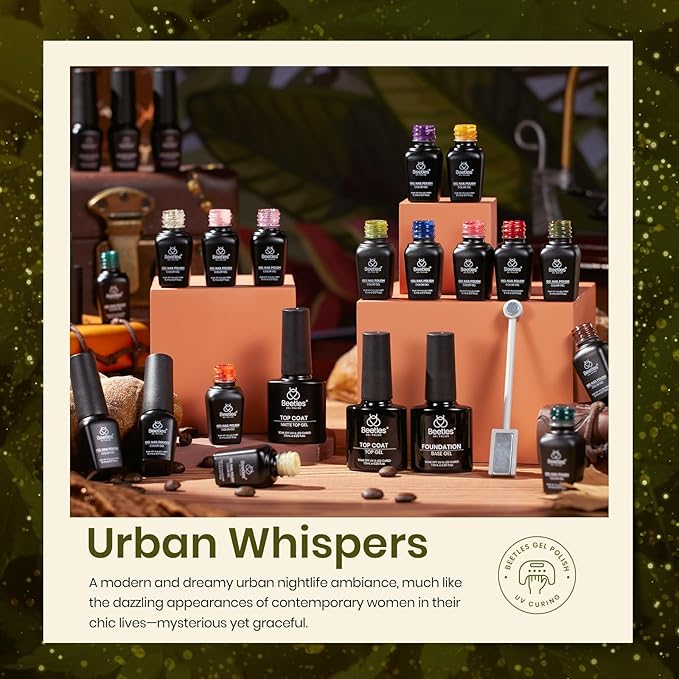 - 【All Season Colors Nail Essentials Kit】Latest nails trend color Gorgeous sence of Beetels Christmas gel nail polish Kit ,you can DIY your favorite nail art at home at any time with Urban Elegance Collection!Tips for Cat Eye Gel Polish: Place the magnetic stick over the surface about 3-5mm for 5-10 secs to get your desired effect!!!!
