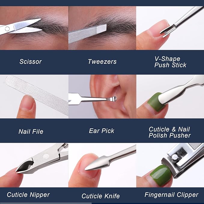- 【FAMILIFE 11Pcs Manicure Kit】 FAMILIFE stainless steel manicure tools kit includes 11 tools, 1x Fingernail Clipper, 1x Toenail Clipper, 1x Cuticle Nipper, 1x Obtuse Push Broach, 1X Nail File, 1x Eyebrow Tweezers, 1x V-Shape Push Stick, 1x Ingrown Toenail Clipper, 1xBeauty Scissors, 1xCuticle Knife, 1xEar Pick, equipped with mens manicure pedicure set care tools for hands, feet, and face. And a portable blue leather case is included which is easy for you to travel