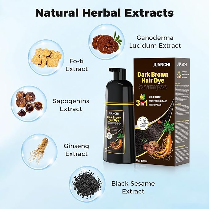 JUANCHI Dark Brown Hair Dye Shampoo 3 in1, Dark Brown Shampoo Hair Dye for Gray Coverage, Natural Hair Color for Women Men, Herbal Formula, Ammonia-free, Lasts 30 Days, 500ml (16.90 oz)