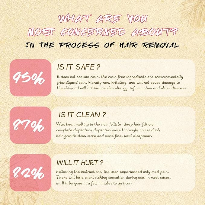 - Sensitive Skin Gospel: Hypoallergenic formula, replace traditional rosin with wheat germ oil and coconut oil, greatly reducing the risk of allergy and discomfort. The unique texture ensures a significant reduction in pain during the hair removal process, providing a more comfortable and reassuring hair removal experience.