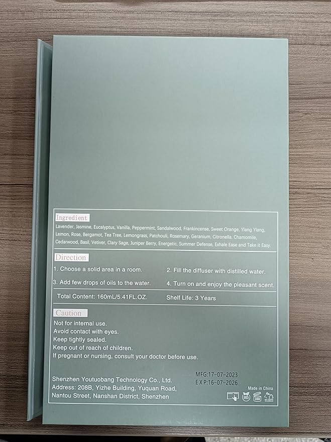 - Diversified Choices: Lavender, Jasmine, Eucalyptus, Vanilla, Peppermint, Sandalwood, Frankincense, Sweet Orange, Ylang Ylang, Lemon, Rose, Bergamot, Tea Tree, Lemongrass, Patchouli, Rosemary, Geranium, Citronella, Chamomile, Cedarwood, Basil, Vetiver, Clary Sage, Juniper Berry, Energetic, Summer Defense, Exhale Ease and Take it Easy.