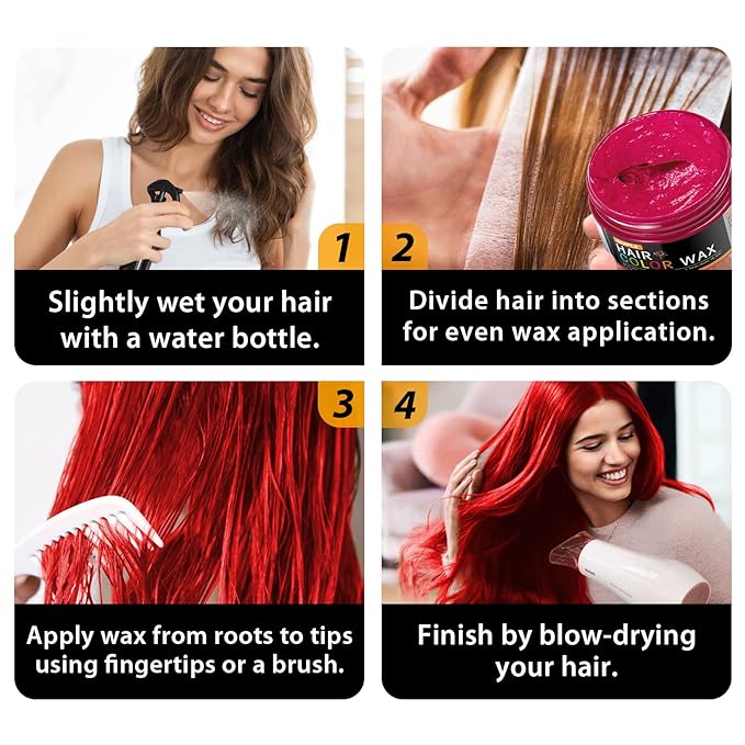 - Explore Fashionable Hair Color Wax Shades : Unleash your creativity with vibrant hair color for women—Green, Purple, Red, and Blue.Simply choose a shade and apply for a bold look that washes out easily