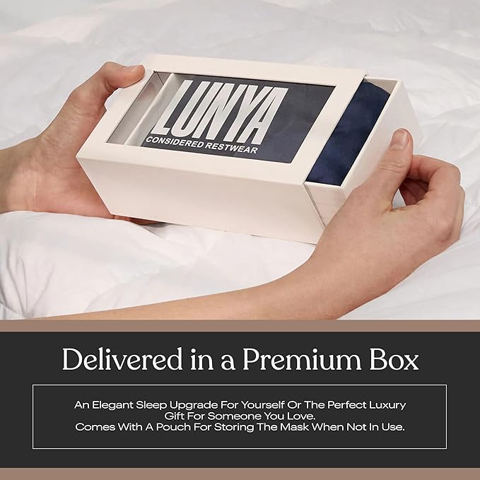 Lunya Sleep Mask with Box - Washable Silk Sleeping Mask and Headband for Beauty Routines - Thermoregulating Comfort for Restful Nights - Silk Eye Mask for Women - Large - Deep Blue