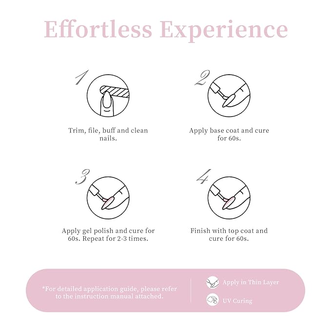- Fast and Simple Nail Polish: MAYCHAO Gel polish must be cured under an LED light. It is necessary to apply a base and top coat. Average LED light duration is 60-120 seconds. Simple application and tenacity.