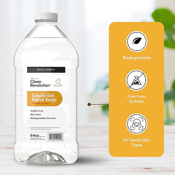 Clean Revolution Liquid Gel Hand Soap, Silky Rich Liquid, Quick Lather, Fast Rinsing, Contains Real Essential Oils (Dreamy Citrus) 64 Fl Oz