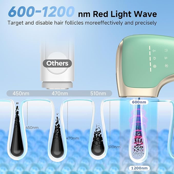- Fast & Effective IPL Hair Removal: with a light wavelength range of 600nm to 1200nm, it quickly penetrates deep into the hair follicles to break the hair growth cycle, achieving permanent results. Visible hair reduction in just 3 weeks, with up to 96% hair reduction after 7-8 weeks of treatment.